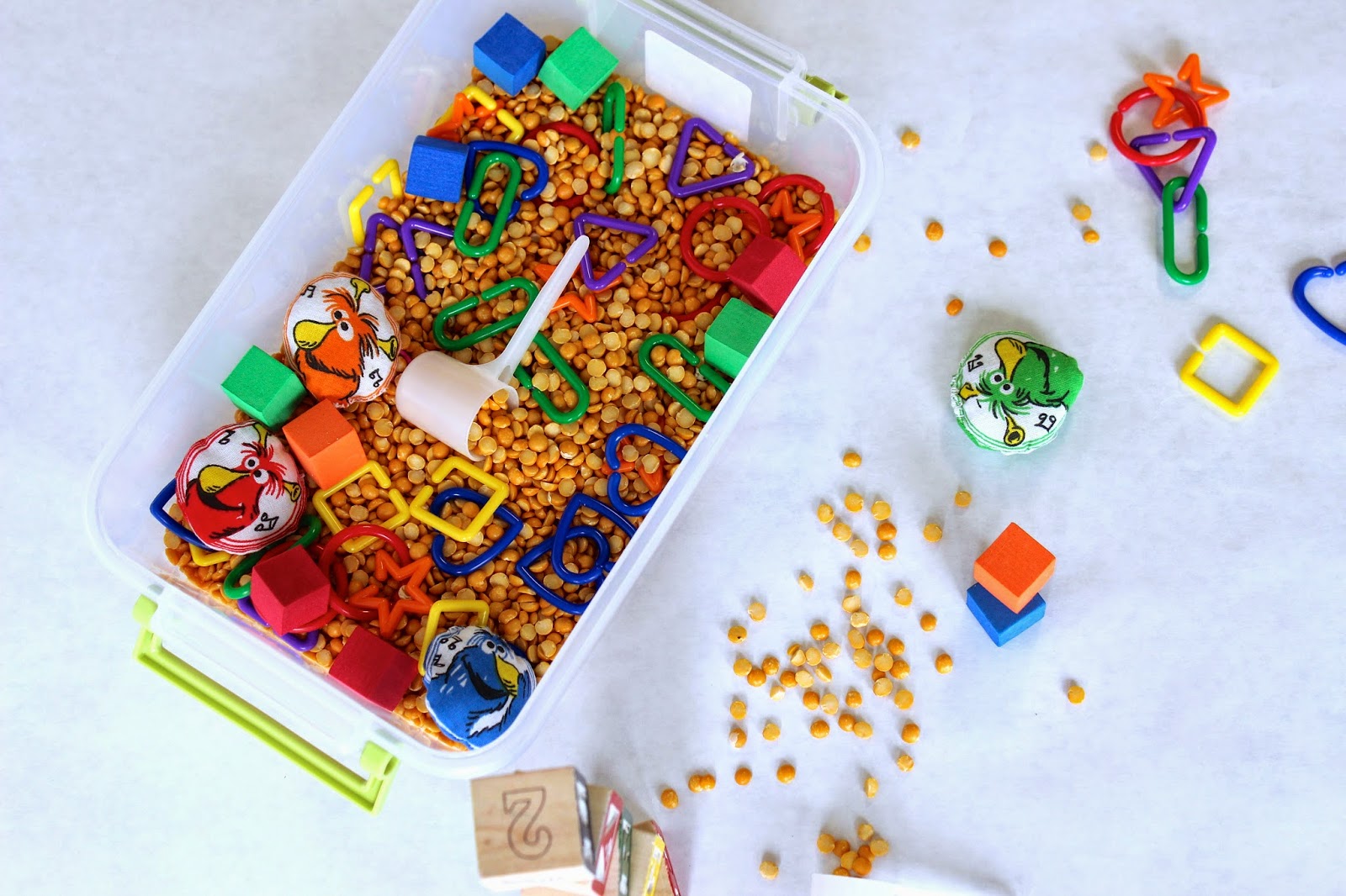This was an extremely inexpensive bin that we will continue to use for a long time. The blocks and linking shapes I bought at the dollar store. The lentils are pretty cheap and totally reusable, you can get those anywhere.
